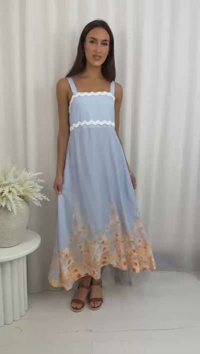 The Bianca Maxi Dress in soft blue features a delicate apricot and tangerine placement print along the hemline, creating a subtle yet striking contrast. Designed with wide adjustable shoulder straps and a shirred back, it ensures a personalised and comfortable fit. The ricrac detail at the bust offers an elegant focal point, combining style and ease for a refined summer wardrobe essential.