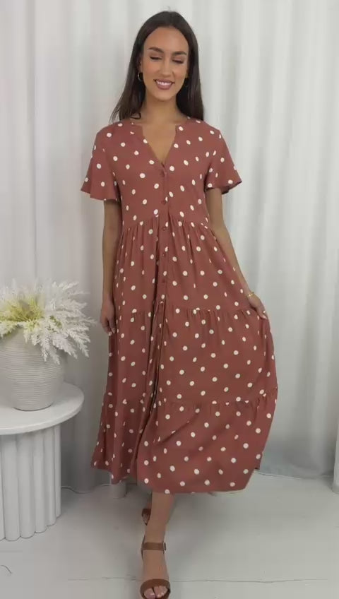The Darcy Spotted Maxi Dress in Rust features a timeless rust and white spotted pattern, expertly crafted with a flattering V-neckline and a button-through front for easy styling. Its flutter sleeves enhance the soft silhouette, while practical side pockets add functionality without compromising elegance. This dress perfectly balances classic charm with modern comfort, making it a sophisticated choice for various occasions.