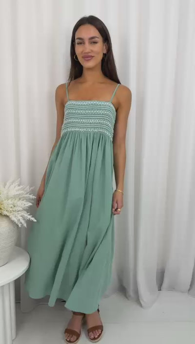 The Lilah Shirred Maxi features adjustable spaghetti straps and a shirred bodice with a contrasting cotton design on the base color. Its flowing silhouette provides a flattering fit, while the cool, comfortable fabric and convenient side pockets make it a summer favorite.